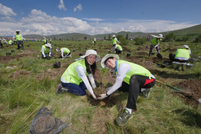 지난해 인도네시아에서는 40여채의 노후주택을 개축해 저소득층의 주거환경을 개선해 주기도 했다.KT&G 대학생 봉사단인 '상상발룬티어'와 임직원들이 지난달 31일 몽골 울란바토르에 건립 중인 'KT&G복지재단 임농업 교육센터' 부지 내에서 묘목을 식재하고 있다.<사진제공=KT&G>