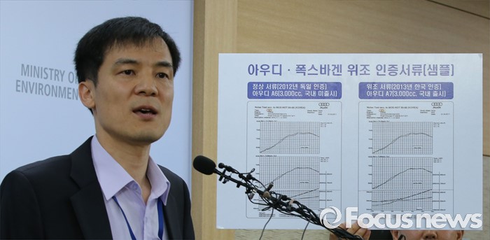 (세종=포커스뉴스) 홍동곤 환경부 교통환경과장이 2일 오전 세종시 정부세종청사 환경부 기자실에서 위조서류로 불법인증을 받은 폭스바겐 32개 차종(80개 모델)에 대해 인증취소 처분을 내렸다고 밝히고 있다.