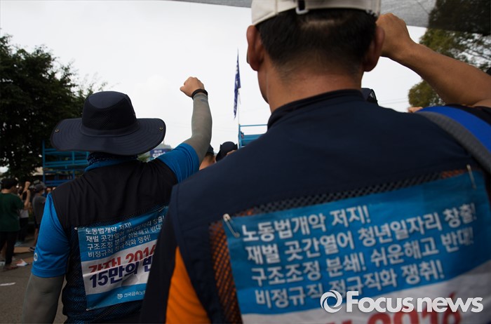 (아산=포커스뉴스) 1일 오전 충남 아산 탕정면 갑을오토텍에서 노조원들이 사측의 경비 용역 투입에 대비하고 있다.