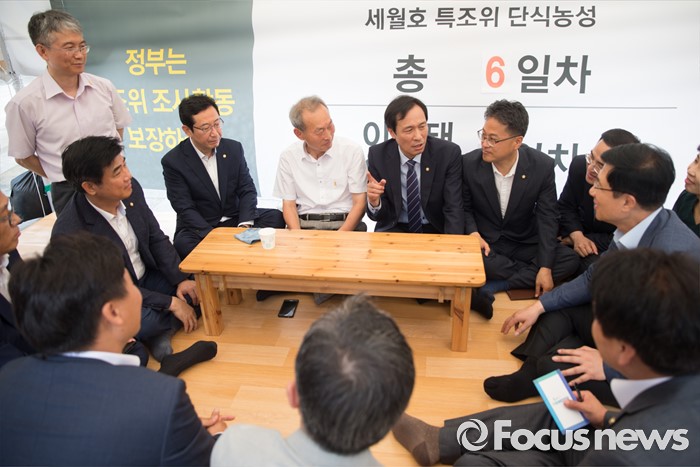 (서울=포커스뉴스) 1일 오전 서울 종로구 광화문 광장에서 이석태 세월호 참사 특별조사위원장의 단식농성장을 방문한 우상호 더불어민주당 원내대표가 관련 발언을 하고 있다.