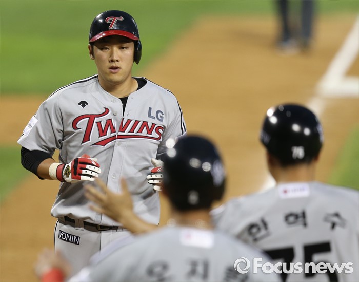 (서울=포커스뉴스) 3일 서울 잠실구장에서 열린 2016 프로야구 LG-두산 경기 4회초 무사 3루에서 LG 양석환이 좌월 2점 홈런을 날리고 홈인하고 있다.