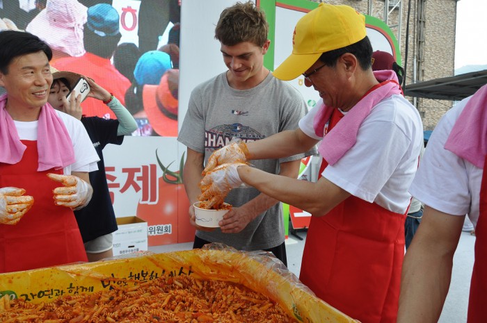 | △ (주)오뚜기가 준비한 천인의 스파게티 행사에서 외국인 관광객에서 스파게티를 나눠주고 있다.jpg |
