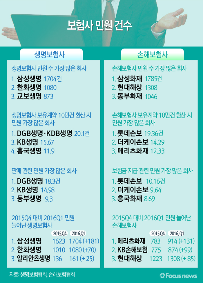 생보사의 민원 중에는 판매와 관련한 민원 비중이 높았다. 2016년 1분기 보유계약 10만건 당 불완전판매 등으로 민원을 넣은 건수를 분석한 결과 DGB생명, KB생명, 동부생명 순으로 건수가 많았다. DGB생명(18.3건), KB생명(14.98건), 동부생명(9.3건) 등이다.