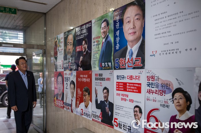 (서울=포커스뉴스) 정진석 새누리당 원내대표가 혁신비상대책위원회의에 참석하기 위해 1일 오전 서울 여의도 새누리당사로 들어서며 오는 9일 전당대회 당대표 및 최고위원 출마 후보들의 포스터를 보고 있다.