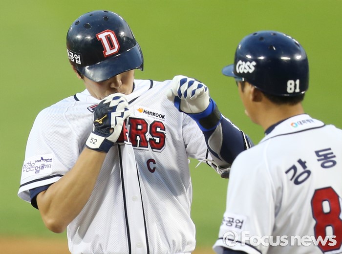 (서울=포커스뉴스) 3일 서울 잠실구장에서 열린 2016 프로야구 LG-두산 경기 2회말 1사 2루에서 두산 김재호가 주자를 불러 들이는 중전 안타를 치고 1루에서 옷깃에 키스하며 강동우 코치의 축하를 받고 있다.