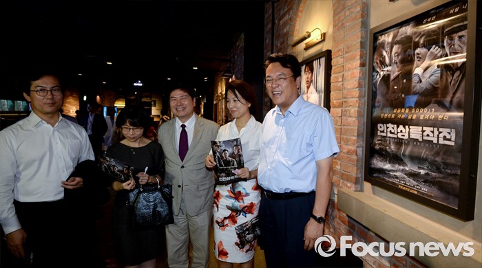 (서울=포커스뉴스) 정진석 새누리당 원내대표와 임윤선, 김영우 혁신비대위원 등이 1일 오후 서울 여의도 한 영화관에서 영화 '인천상륙작전' 관람에 앞서 대화하고 있다.