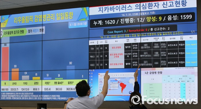 (청주=포커스뉴스) 2016 브라질 리우올림픽을 앞둔 1일 오후 충북 청주 흥덕구 오송 질병관리본부에 설치된 리우올림픽 감염병 대응 긴급상황실에서 관계자들이 지카바이러스 감염병 발생 동향 등을 살피고 있다.