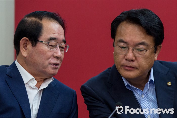 (서울=포커스뉴스) 정진석(오른쪽) 새누리당 원내대표와 박명재 사무총장이 1일 오전 서울 여의도 새누리당사에서 열린 혁신비상대책위원회의에 참석해 대화 하고 있다.