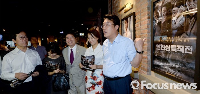 (서울=포커스뉴스) 정진석 새누리당 원내대표와 임윤선, 김영우 혁신비대위원 등이 1일 오후 서울 여의도 한 영화관에서 영화 '인천상륙작전' 관람에 앞서 대화하고 있다.