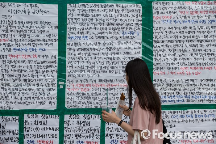 (서울=포커스뉴스) 2일 오전 서울 서대문구 이화여대 정문에 최경희 이화여대 총장의 미래라이프 단과대학 설립 추진을 규탄하는 대자보가 부착돼 있다.