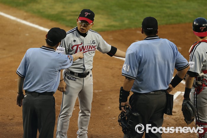 (서울=포커스뉴스) 2일 오후 서울 잠실구장에서 열린 2016 프로야구 LG-두산 경기 3회말 1사 2루에서 두산 김재호가 류지혁의 2루 땅볼에 런다운에 걸려 LG 히메네스에 태그아웃 당했지만 박재욱의 주루 방해로 세이프 판정이 나자 양상문 감독이 그라운드에 나와 심판진과 이야기를 나누고 있다.