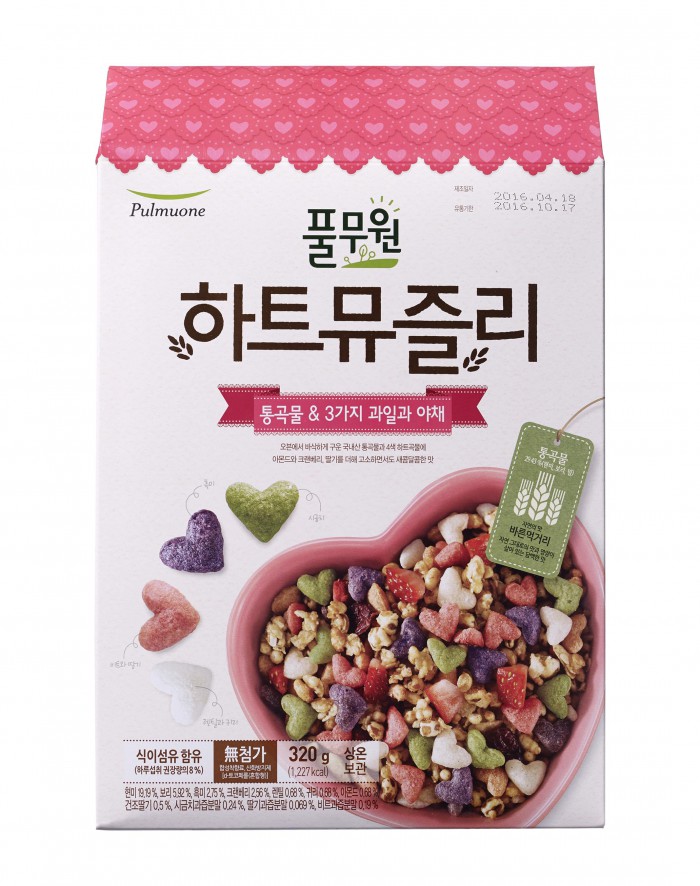 하트뮤즐리는 통곡물 뮤즐리에 4가지 색상의 알록달록한 하트 모양 곡물을 더했다. 하트 곡물은 쌀, 렌틸, 귀리 반죽에 딸기, 비트, 시금치, 흑미 등 과일과 채소에서 추출한 천연색을 입혔다.