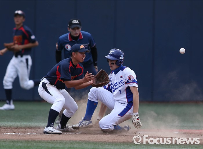 (서울=포커스뉴스) 1일 오후 서울 양천구 목동종합운동장에서 열린 2016 세계 청소년 야구 대회 '한국A VS 일본A' 경기에서 1회초 손동현 선수가 3루에서 슬라이딩하며 세이프되고 있다.