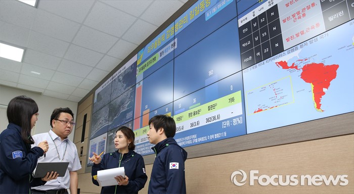 (청주=포커스뉴스) 2016 브라질 리우올림픽을 앞둔 1일 오후 충북 청주 흥덕구 오송 질병관리본부에 설치된 리우올림픽 감염병 대응 긴급상황실에서 관계자들이 지카바이러스 감염병 발생 동향 등을 살피고 있다.