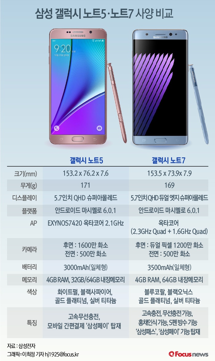 | △ [그래픽] 삼성 갤럭시 노트5·노트7 사양 비교 |