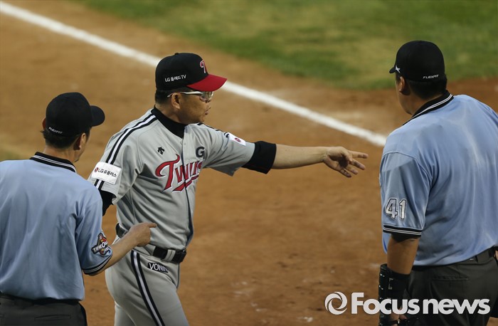 | △ 심판진에게 항의하는 양상문 감독 |