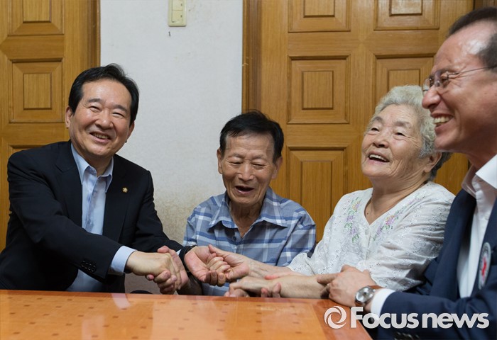 (서울=포커스뉴스) 정세균(왼쪽 첫번째) 국회의장이 2일 오전 서울 종로구 창신동에 거주하고 있는 고령 이산가족 김문각 할아버지(84세, 평안남도 양덕군 청계리), 이오례 할머니 부부 가정을 방문해 대화 중 손을 잡고 있다. 오른쪽 첫번재는 강호권 대학적십자사 사무총장.