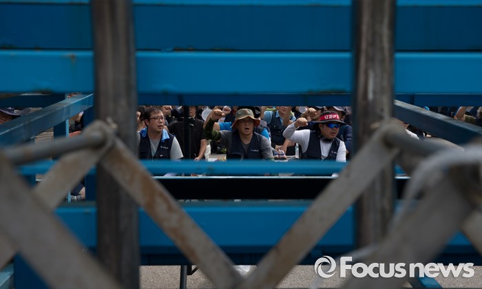 (아산=포커스뉴스) 1일 오전 충남 아산 탕정면 갑을오토텍에서 노조원들이 사측의 경비 용역 투입에 대비하고 있다.
