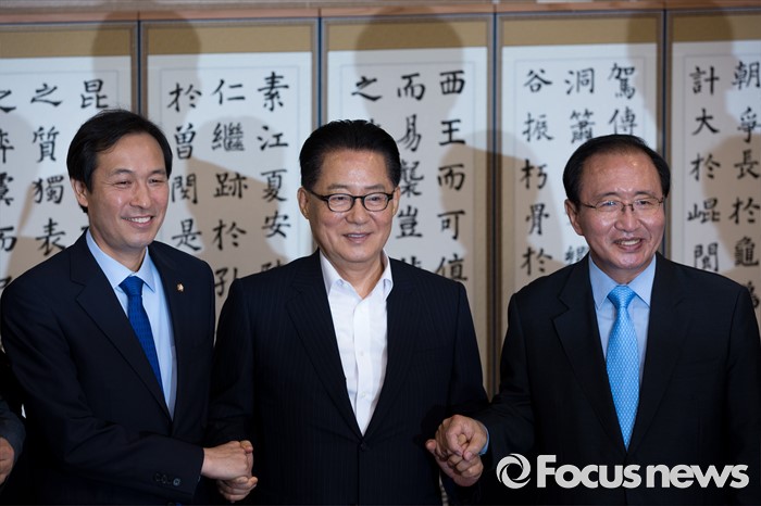 (서울=포커스뉴스) 야3당 원내대표가 3일 오전 서울 여의도 국회에서 열린 원내대표 회동에 참석해 손을 맞잡고 사진촬영을 하고 있다. 왼쪽부터 우상호 더불어민주당 원내대표, 박지원 국민의당 원내대표, 노회찬 정의당 원내대표.
