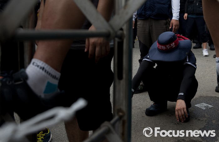 (아산=포커스뉴스) 1일 오후 충남 아산 탕정면 갑을오토텍에서 노조원들과 사측 경비 용역들이 대치하고 있다.