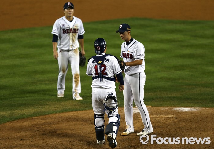 (서울=포커스뉴스) 2일 오후 서울 잠실구장에서 열린 2016 프로야구 LG-두산 경기에서 승리한 투수 고봉재가 축하를 받고 있다.