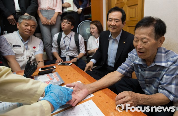 (서울=포커스뉴스) 정세균 국회의장이 2일 오전 서울 종로구 창신동에 거주하고 있는 고령 이산가족 김문각 할아버지(84세, 평안남도 양덕군 청계리) 가정을 방문해 이산가족 상봉 준비를 위한 김 할아버지의 혈액 채취 과정을 지켜보고 있다.