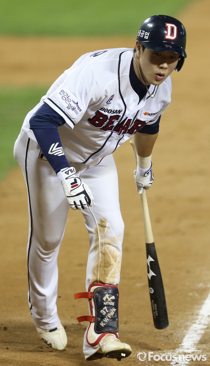 (서울=포커스뉴스) 3일 서울 잠실구장에서 열린 2016 프로야구 LG-두산 경기 8회말 1사후 두산 박건우가 중월 솔로 홈런을 치고 홈인하며 자신의 배트를 챙기고 있다.