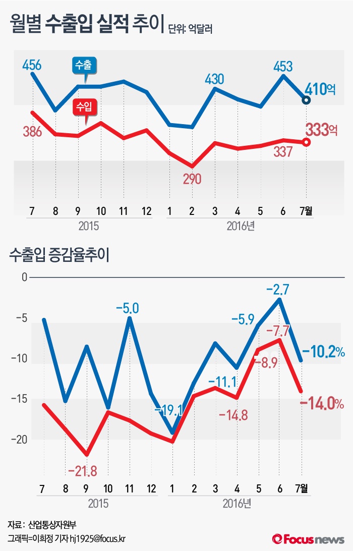 (서울=포커스뉴스) 산업통상자원부는 지난 7월 수출이 지난해 같은기간 대비 10.2% 줄어든 410억달러를 기록했다고 1일 밝혔다.