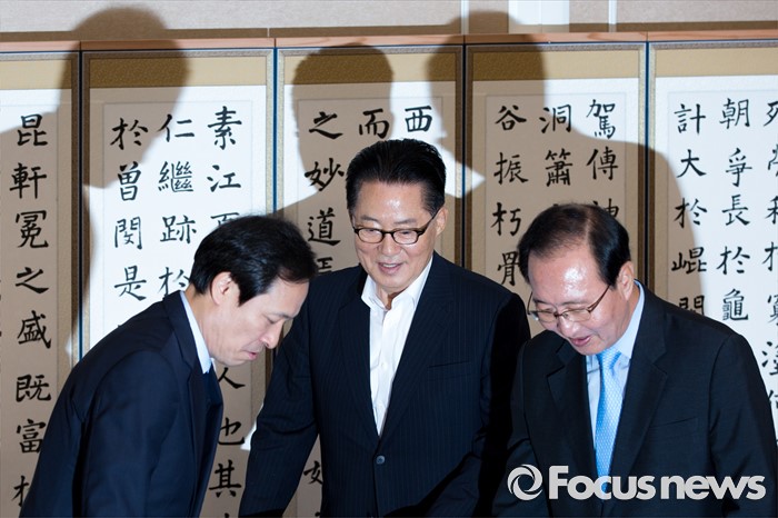 (서울=포커스뉴스) 야3당 원내대표가 3일 오전 서울 여의도 국회에서 열린 원내대표 회동에 참석해 인사를 나눈 뒤 자리에 앉고 있다. 왼쪽부터 우상호 더불어민주당 원내대표, 박지원 국민의당 원내대표, 노회찬 정의당 원내대표.