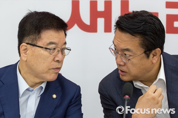 (서울=포커스뉴스) 정진석(오른쪽) 새누리당 원내대표와 김광림 정책위의장이 2일 오전 서울 여의도 국회에서 열린 원내대책회의에 참석해 의견을 나누고 있다.