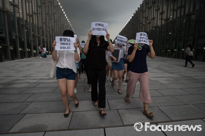 (서울=포커스뉴스) 2일 오후 서울 서대문구 이화여대에서 미래라이프 대학 설립에 반대하는 이화여자대학교 학생들이 교내를 행진하며 시위하고 있다.