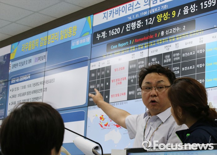 (청주=포커스뉴스) 2016 브라질 리우올림픽을 앞둔 1일 오후 충북 청주 흥덕구 오송 질병관리본부에 설치된 리우올림픽 감염병 대응 긴급상황실에서 관계자들이 지카바이러스 감염병 발생 동향 등을 살피고 있다.