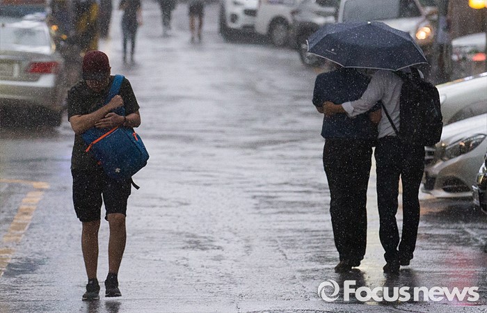 (서울=포커스뉴스) 천둥, 번개를 동반한 강한비가 내린 2일 오후 서울 서초구 교대역 주변에서 시민들이 비를 피해 발걸음을 재촉하고 있다.