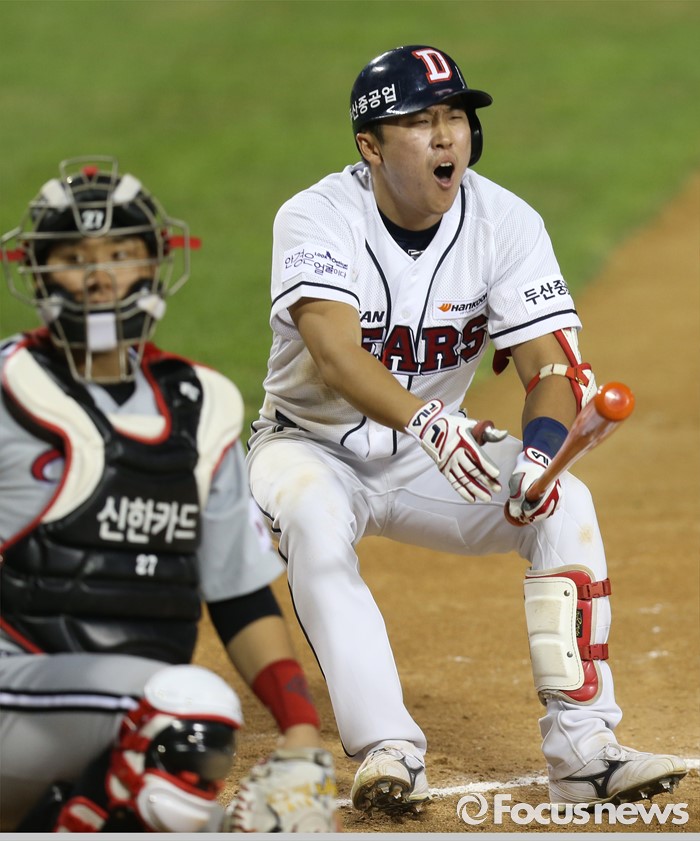 (서울=포커스뉴스) 3일 서울 잠실구장에서 열린 2016 프로야구 LG-두산 경기 7회말 1사 1,2루에서 두산 허경민이 파울에 크게 실망하고 있다.