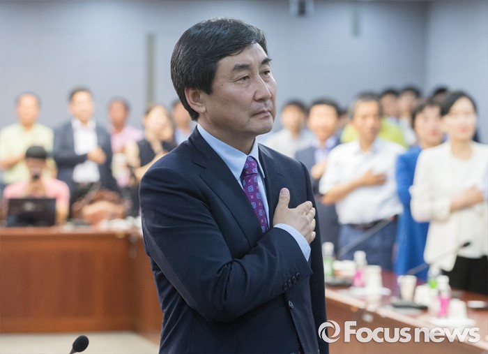 (서울=포커스뉴스) 1일 오후 서울 여의도 국회 의원회관에서 열린 더불어민주당 자치분권민주지도자회의 당대표 후보자 초청 토론회에 참석한 이종걸 의원이 국기에 대한 경례를 하고 있다.