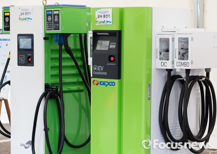 (서울=포커스뉴스) 2일 오후 서울 마포구 상암월드컵경기장에서 열린 개방형 전기차 충전소 1호 착공식에서 급속충전기가 전시돼 있다.
