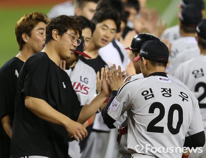 (서울=포커스뉴스) 3일 서울 잠실구장에서 열린 2016 프로야구 LG-두산 경기에서 LG 승리투수 류제국이 마무리 임정우를 맞이하고 있다.