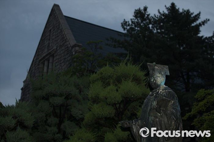 (서울=포커스뉴스) 이화여대 미래라이프 대학 설립 문제로 학교와 학생들이 갈등을 빚고 있는 2일 밤, 서울 서대문구 이화여대 본관 인근에 김활란 초대 총장의 동상이 페인트와 계란으로 얼룩져있다.