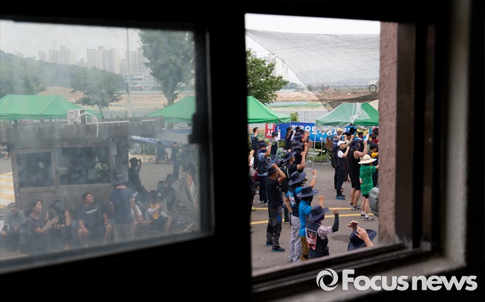 (아산=포커스뉴스) 1일 오후 충남 아산 탕정면 갑을오토텍에서 노조원들과 사측 경비 용역들이 대치하고 있다.