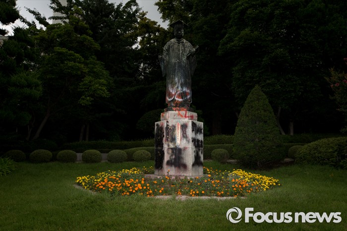 (서울=포커스뉴스) 이화여대 미래라이프 대학 설립 문제로 학교와 학생들이 갈등을 빚고 있는 2일 오전 서울 서대문구 이화여대 본관 인근에 김활란 초대 총장의 동상이 페인트와 계란으로 얼룩져있다.