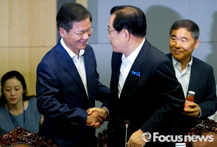 (서울=포커스뉴스) 2일 오전 서울 여의도 국회 의원회관에서 열린 국민의당 의원총회에 참석한 천정배(왼쪽) 전 공동대표와 박준영(가운데) 의원이 인사하고 있다. 검찰은 수억 원대 공천헌금을 수수한 혐의로 박준영 의원에 대해 구속영장을 재청구했지만 기각됐다.