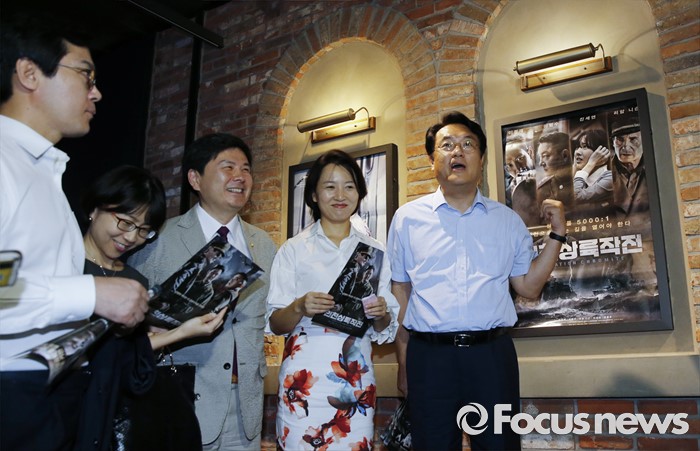 (서울=포커스뉴스) 정진석 새누리당 원내대표가 1일 오후 서울 여의도 한 영화관에서 영화 '인천상륙작전' 관람에 앞서 동료 의원들과 대화하고 있다.