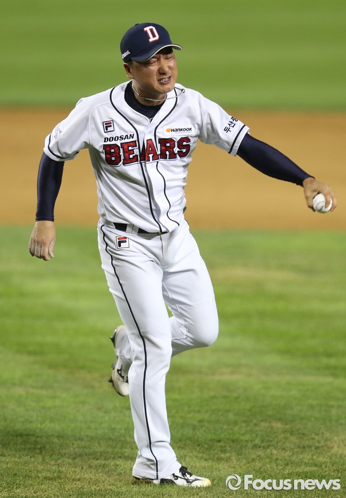 (서울=포커스뉴스) 3일 서울 잠실구장에서 열린 2016 프로야구 LG-두산 경기 8회초 LG 박용택의 타구에 맞은 두산 투수 정재훈이 고통스러워하고 있다.