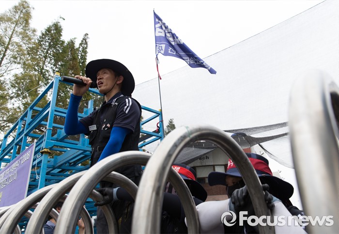 (아산=포커스뉴스) 1일 오후 충남 아산 탕정면 갑을오토텍에서 노조원들이 사측 경비 용역 진입을 반대하며 구호를 외치고 있다.