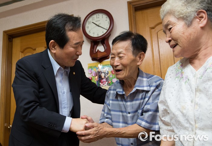 (서울=포커스뉴스) 정세균 국회의장이 2일 오전 서울 종로구 창신동에 거주하고 있는 고령 이산가족 김문각 할아버지(84세, 평안남도 양덕군 청계리) 가정을 방문해 김 할아버지와 인사하고 있다. 오른쪽은 아내 이오례 할머니.