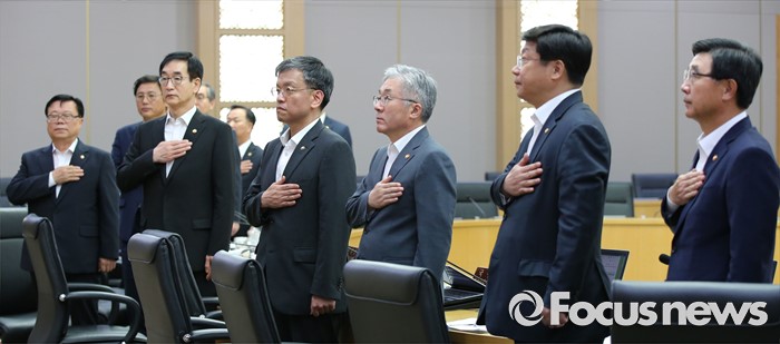 (세종=포커스뉴스) 2일 오전 세종시 정부세종청사 국무회의장에서 열린 청와대-세종 영상 국무회의에서 국무위원들이 국기에 대한 경례를 하고 있다.