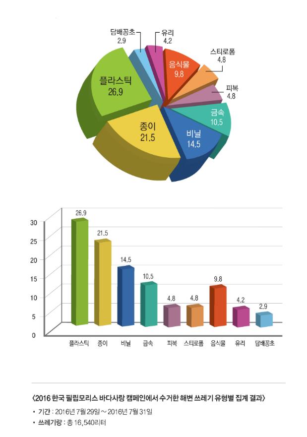 해양 정화 봉사단체인 '아름다운 세상을 위한 공동체포럼'은 '2016 한국필립모리스 바다사랑 캠페인'에 참가한 180여명의 자원봉사원들이 지난달 29일부터 3일간 수거한 약 1만7000리터의 쓰레기를 집계·분석한 '해변 쓰레기 분류 조사' 결과를 4일 발표했다.