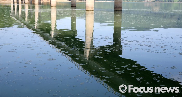 (청주=포커스뉴스) 폭염이 이어지면서 대청호 수역에 조류경보 '관심' 단계가 내려진 가운데 4일 오후 충북 청주시 상당구 문의대교 인근 대청호에 녹조가 형성돼 있다.