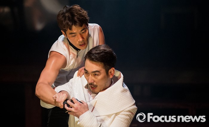 (서울=포커스뉴스) 4일 오후 서울 중구 충무아트센터에서 열린 연극 '햄릿-더 플레이' 언론시연회에 참석한 배우 김강우(위), 이갑선이 열연하고 있다.