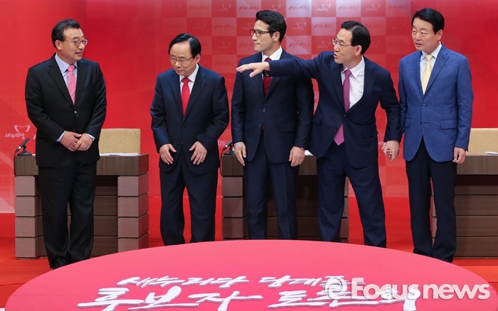 (서울=포커스뉴스) 4일 오후 서울 강서구 등촌동 SBS공개홀에서 새누리당 대표 경선 4차 TV토론회을 마친 의원들이 포즈를 취하기 위해 준비하고 있다. 오른쪽부터 한선교, 주호영, 정병국, 이주영, 이정현 의원.